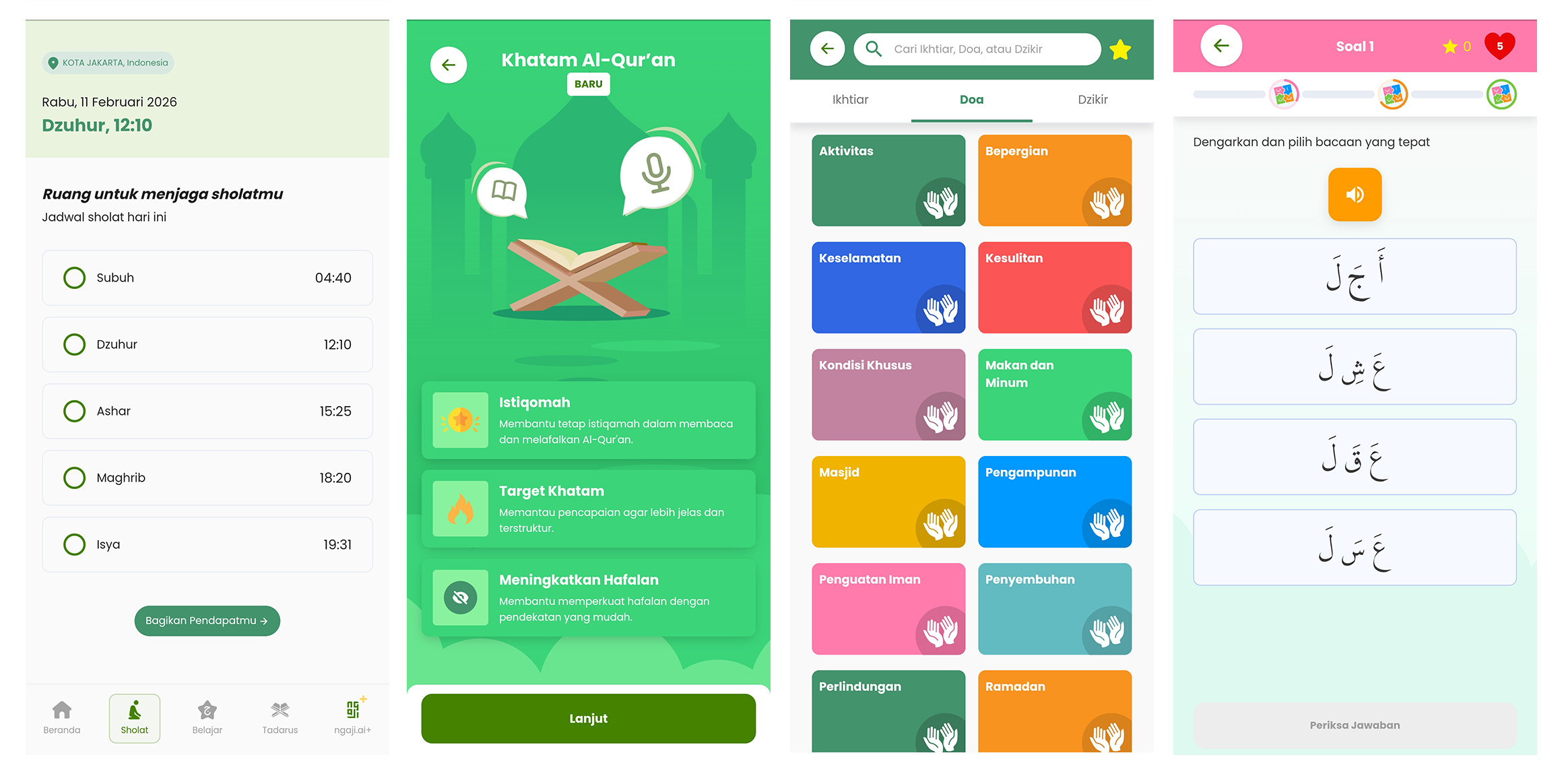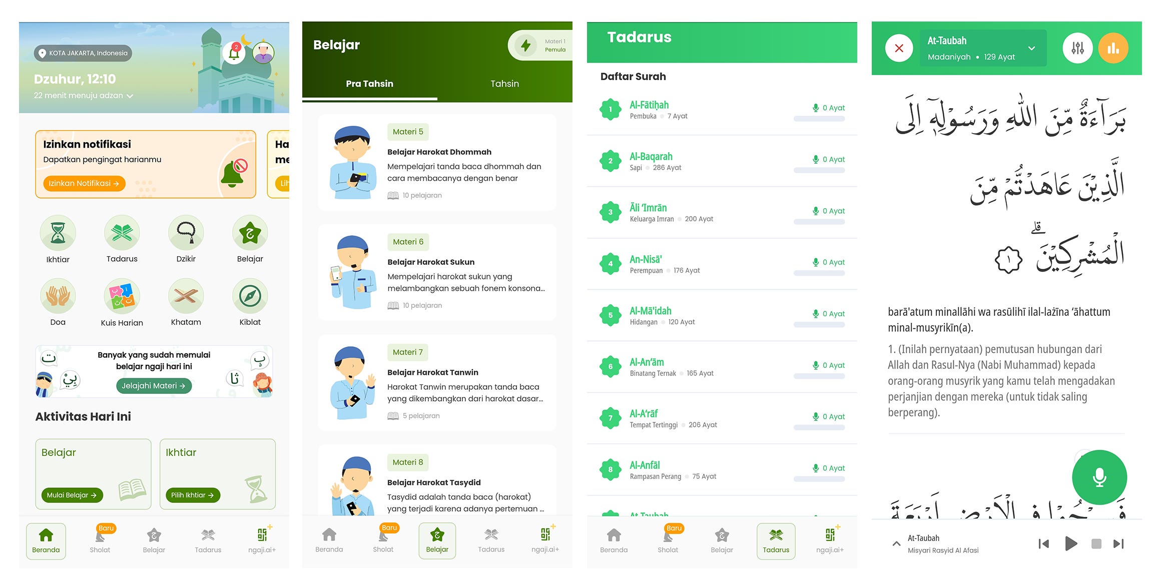 đ Tadarus: Users can read and learn the meaning of all 114 Qurâan surahs, listen to audio for correct pronunciation, and record their own recitation to be evaluated by AI.