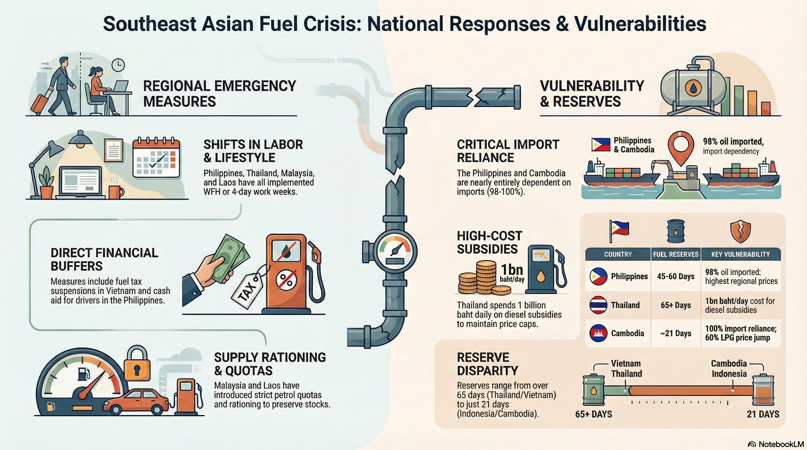 🇵🇭 Philippines – Declared a national energy emergency, the first in Southeast Asia. Implemented a four-day work week for government workers and offered cash aid to transport drivers. Imports 98% of its oil, with petrol and diesel prices now among the highest in the region (diesel ~$2.30 per litre). Holds commercial reserves for 45–60 days, but the government has little direct control over them.