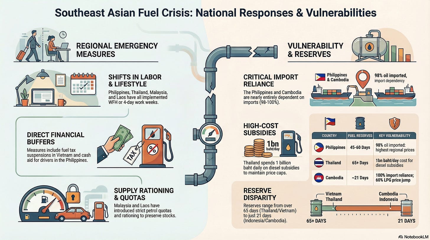 🛢️ Limited strategic reserves: Unlike Japan (254 days) or South Korea (208 days), Southeast Asian reserves are dangerously thin: Indonesia (21-23 days), the Philippines (45-60 days in commercial hands), and Vietnam (65 days combined, but only 5-7 days in state reserves).